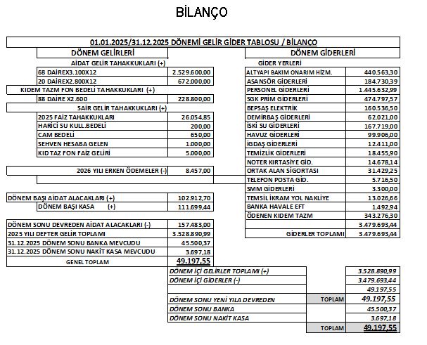 SİTELERDE DÖNEM SONU MALİ TABLOLAR
